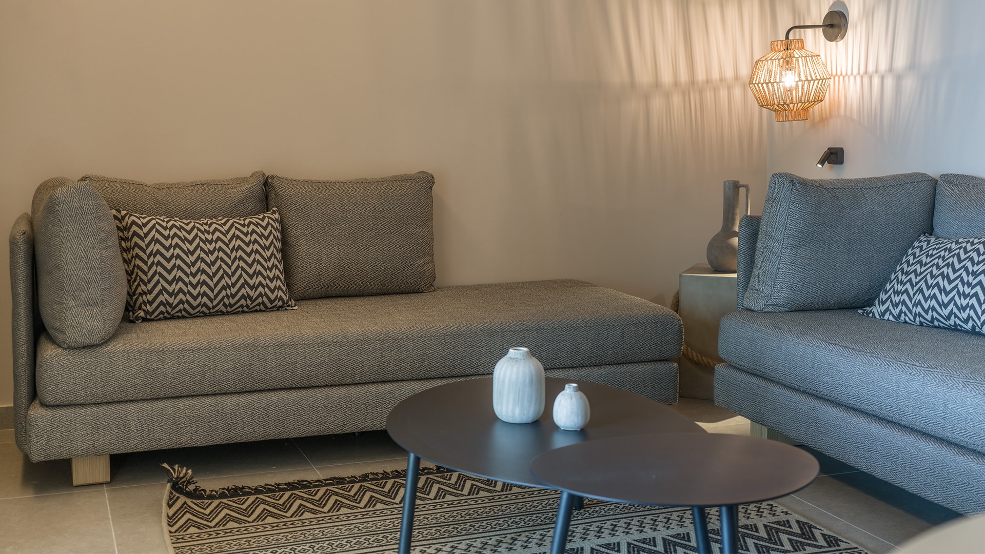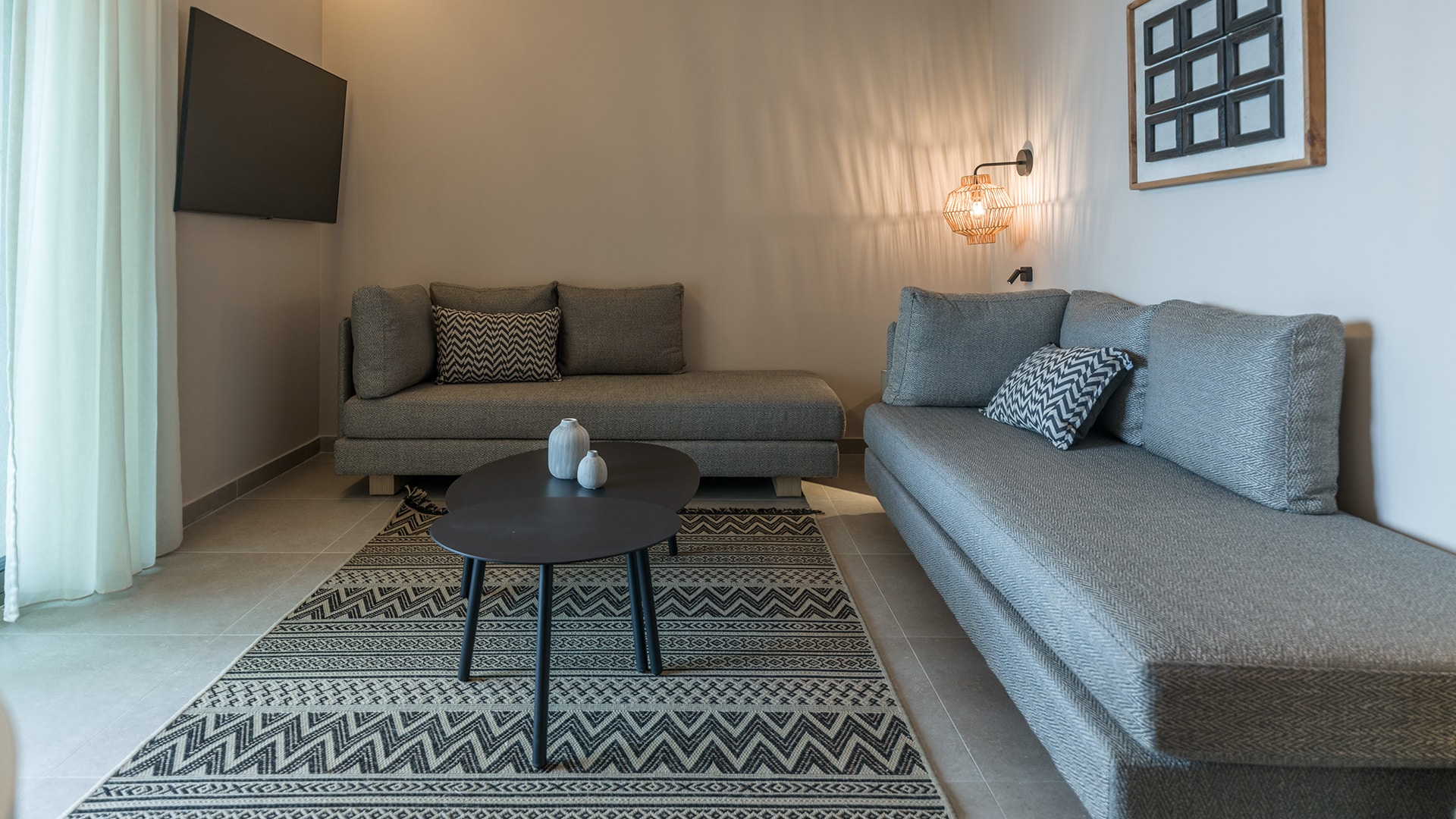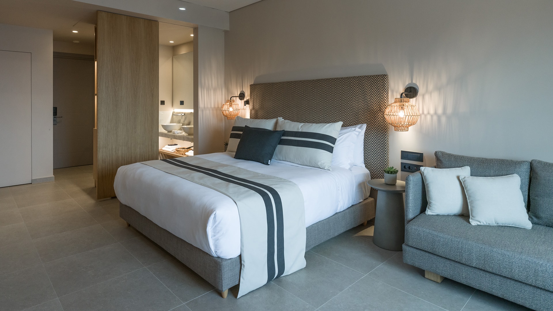 Spacious, elegant, and designed for a serene retreat. The Deluxe Suite offers 67 sqm of stylish living, ideal for up to five guests. The separate bedroom features a king-size bed dressed in the finest cotton linens, while the sophisticated living area includes contemporary furnishings and two large sofas for added comfort. A sleek bathroom with a walk-in rain shower completes the space.