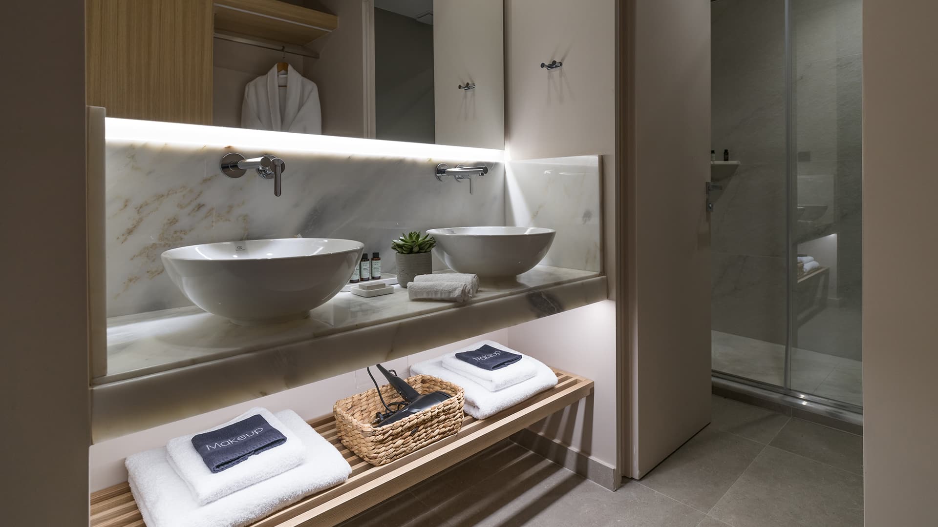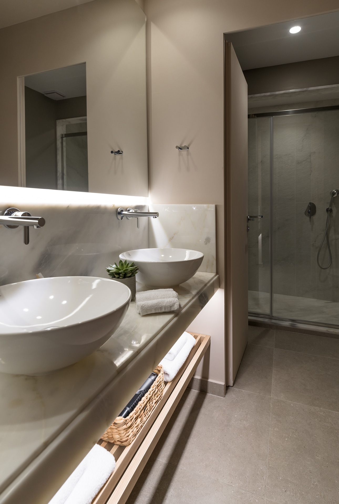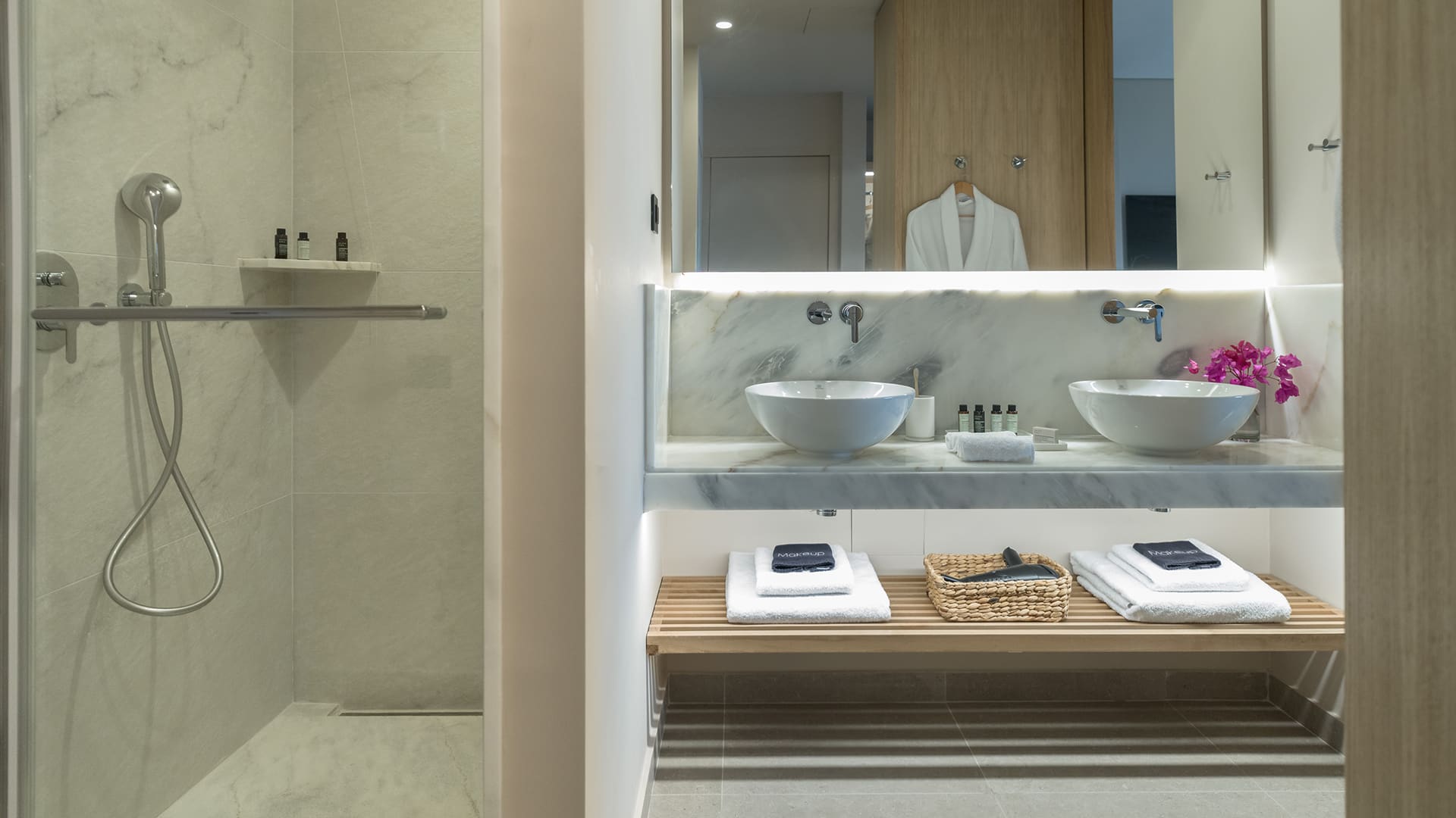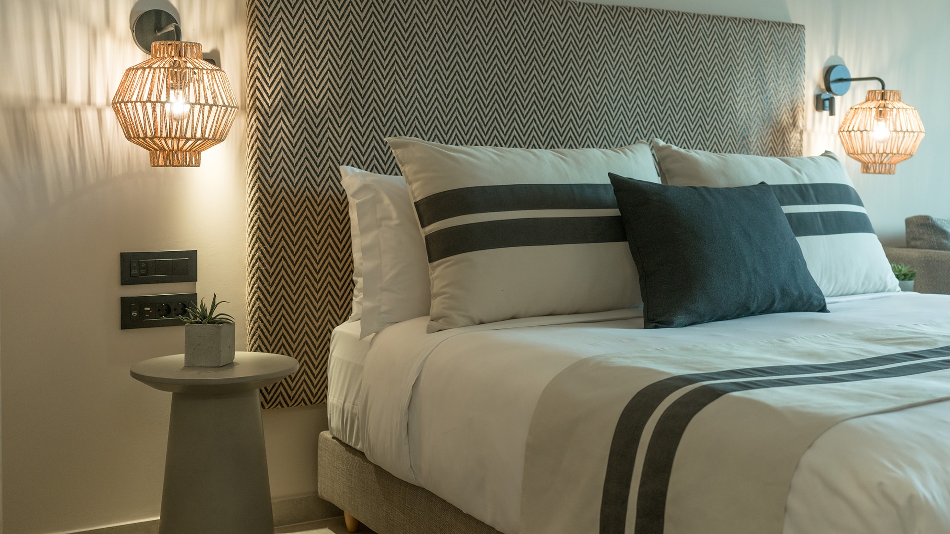 Spacious, elegant, and designed for a serene retreat. The Deluxe Suite offers 67 sqm of stylish living, ideal for up to five guests. The separate bedroom features a king-size bed dressed in the finest cotton linens, while the sophisticated living area includes contemporary furnishings and two large sofas for added comfort. A sleek bathroom with a walk-in rain shower completes the space.