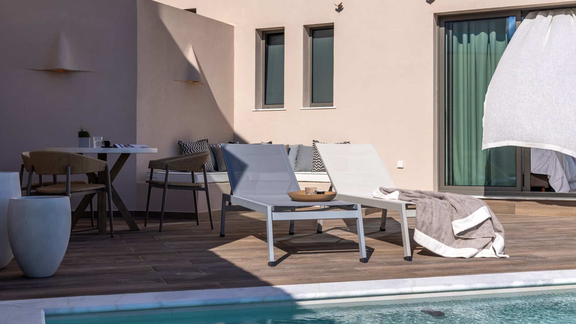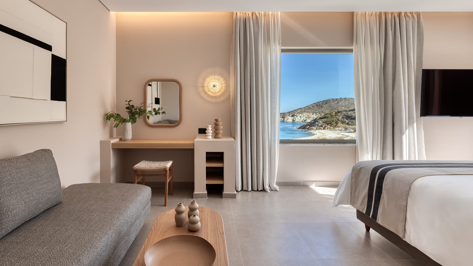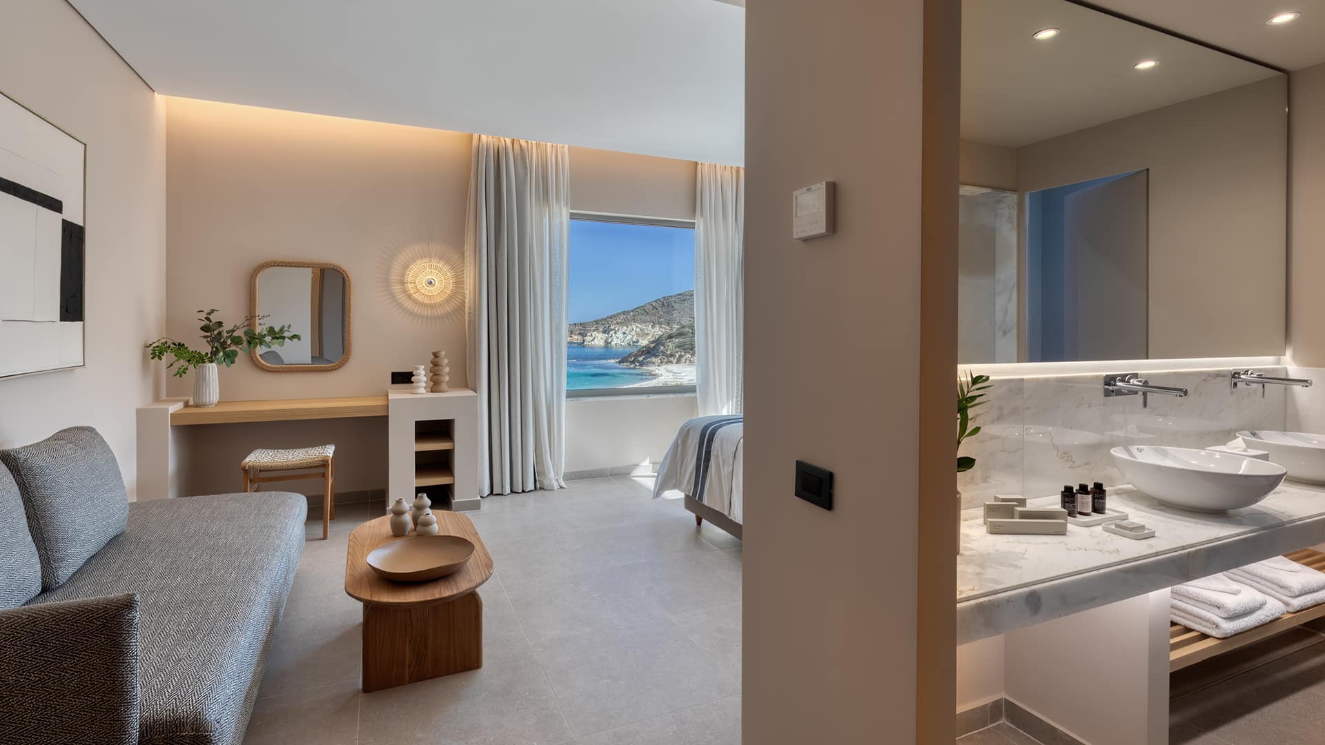 Our Aegean Ethereal Suite offers a king-size bed, sofa bed, and dining table for four, blending modern elegance with comfort. The marble-lined bathroom features a double vanity and rain shower, while the spacious, fully furnished veranda unveils sweeping vistas of Heromylos Bay. A refined escape where every moment is framed by the endless horizon.