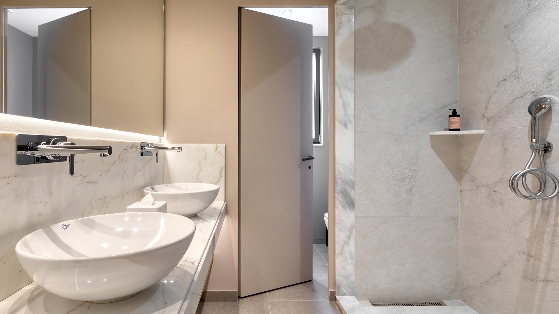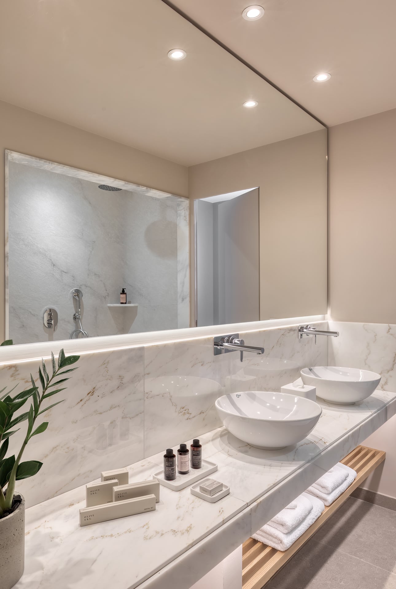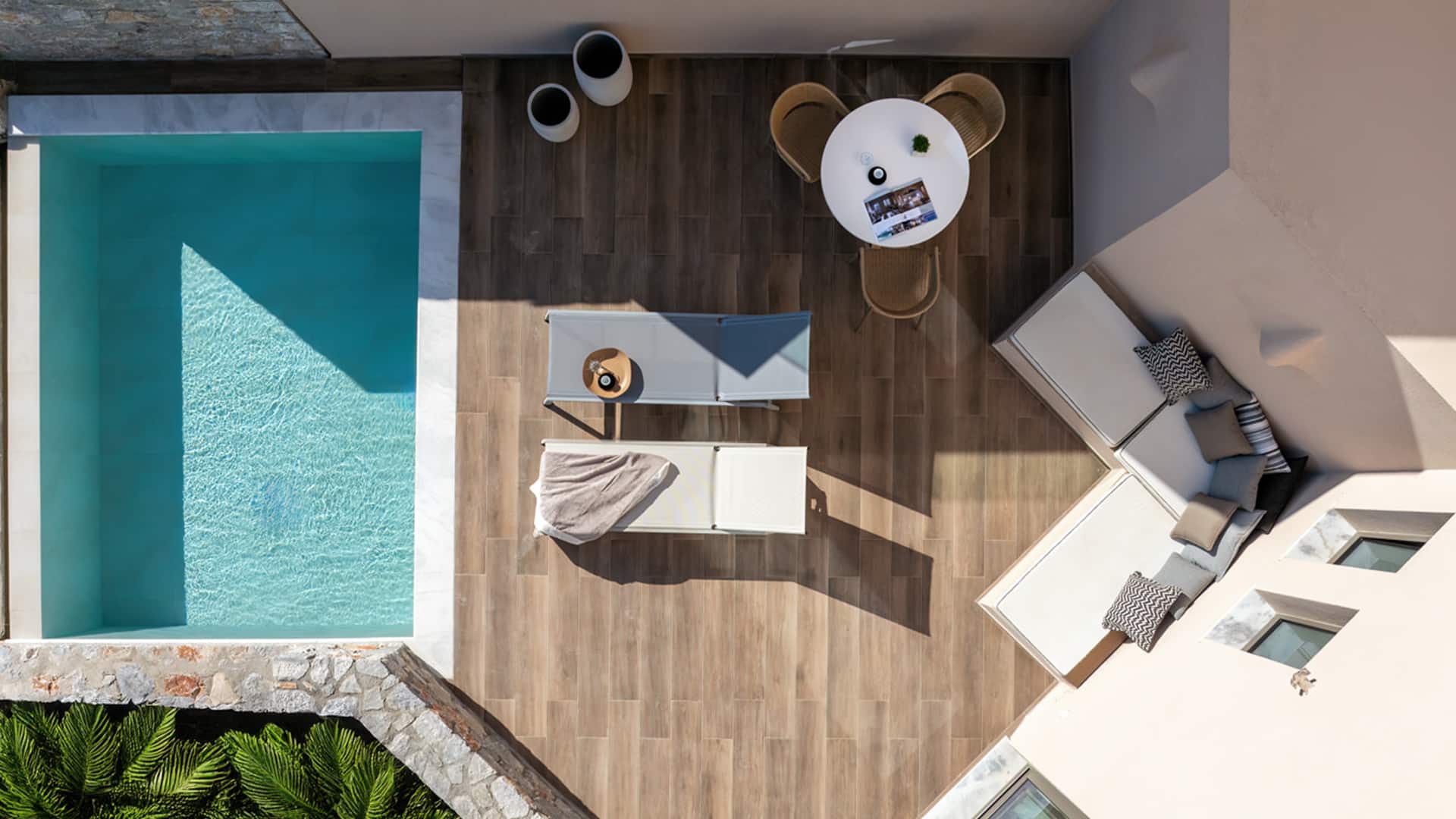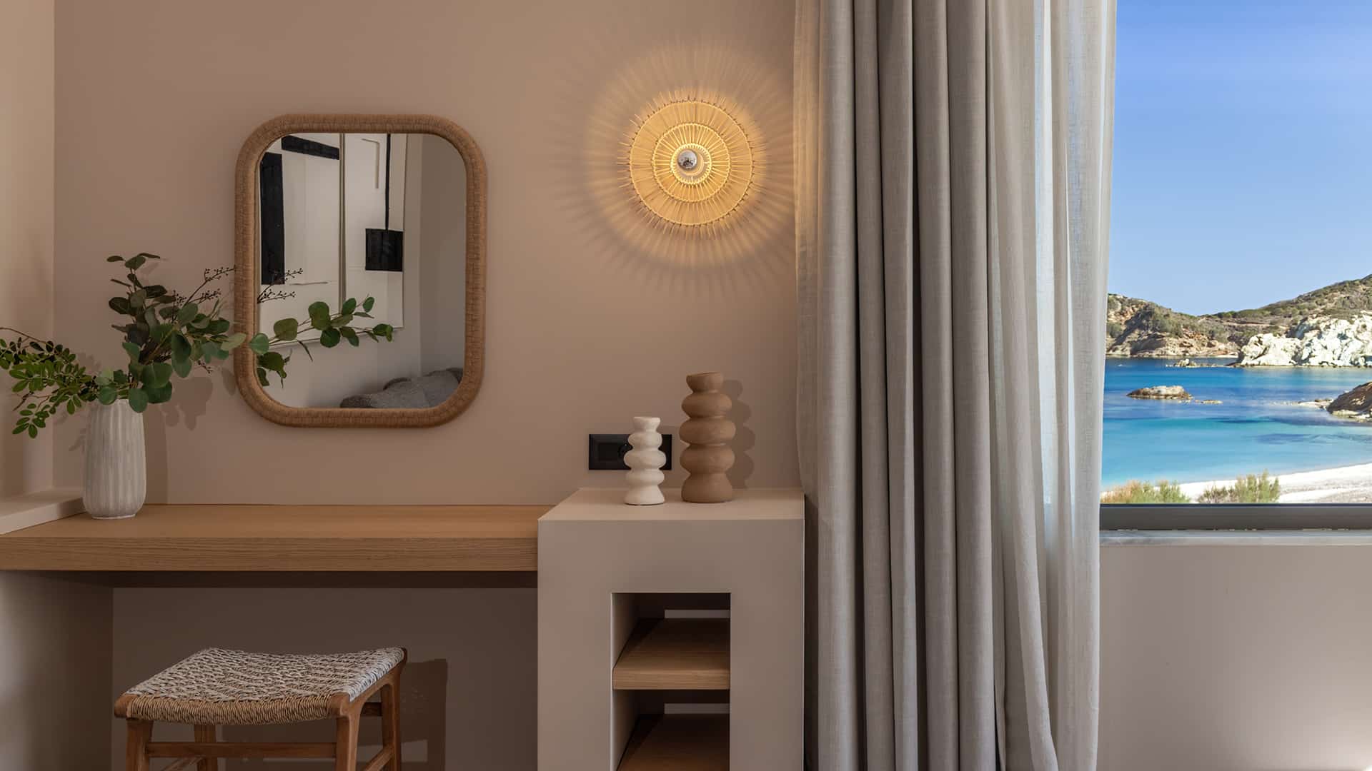 Our Aegean Ethereal Suite offers a king-size bed, sofa bed, and dining table for four, blending modern elegance with comfort. The marble-lined bathroom features a double vanity and rain shower, while the spacious, fully furnished veranda unveils sweeping vistas of Heromylos Bay. A refined escape where every moment is framed by the endless horizon.
