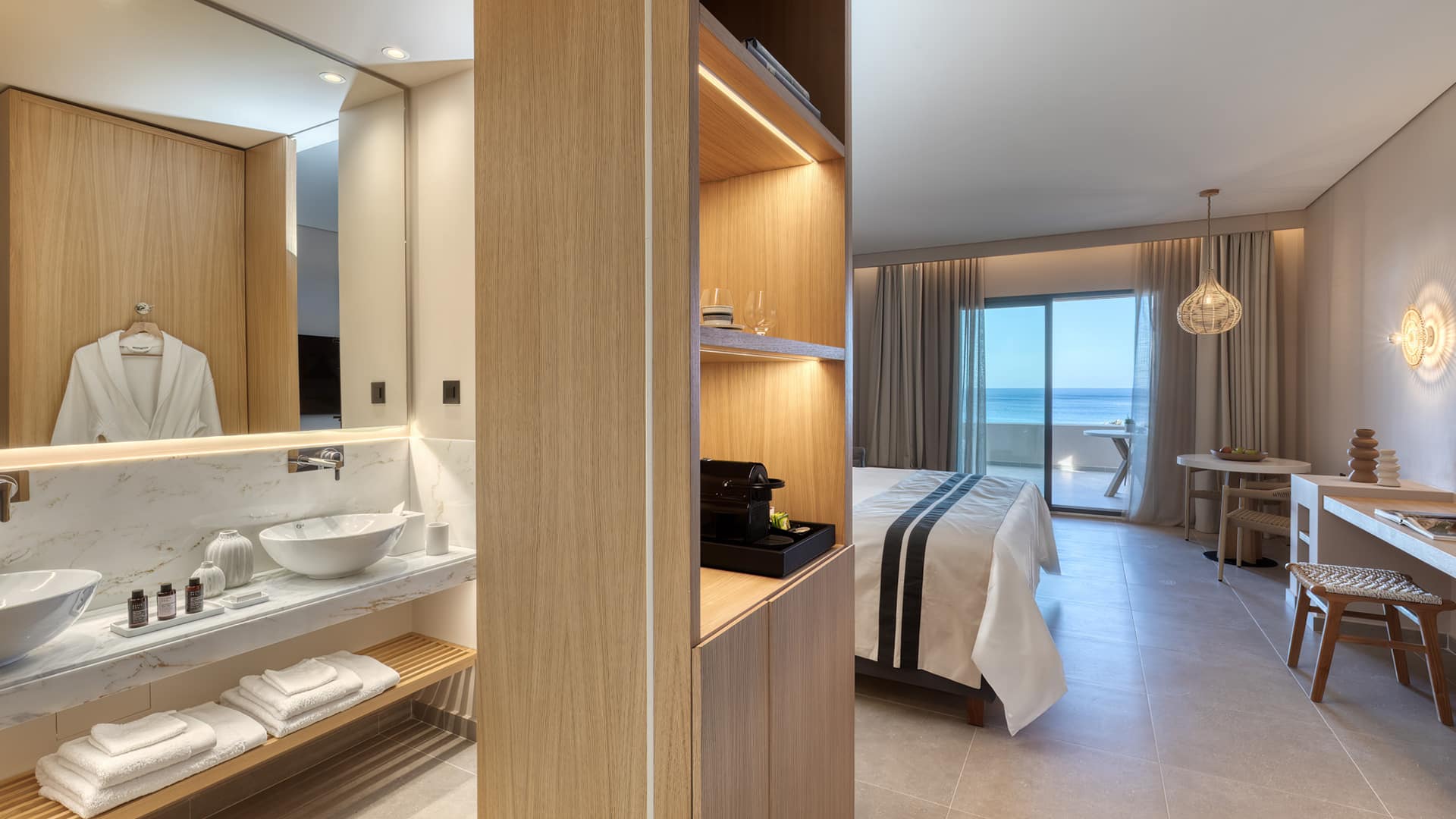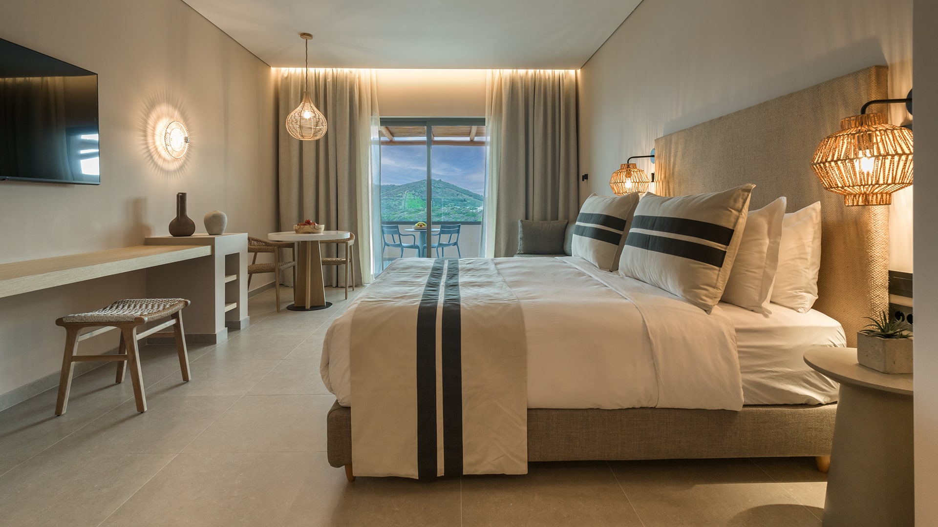 A stylish sanctuary embraced by the resort’s peaceful ambiance. The Junior Suite combines contemporary elegance with comfort, featuring a king-size bed, a cozy sofa bed, and a sleek bathroom with a walk-in rain shower. Expansive windows lead to a spacious, fully furnished veranda, an inviting space to unwind and take in the serene surroundings. A perfect escape designed for relaxation and effortless luxury.