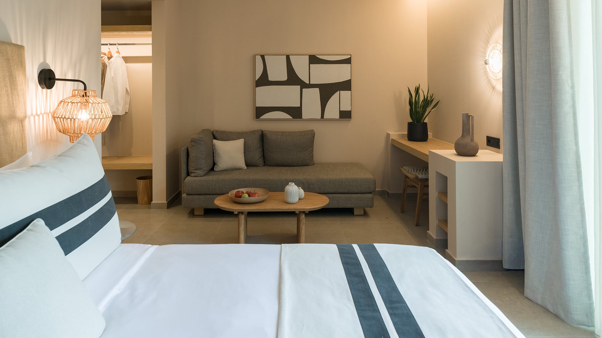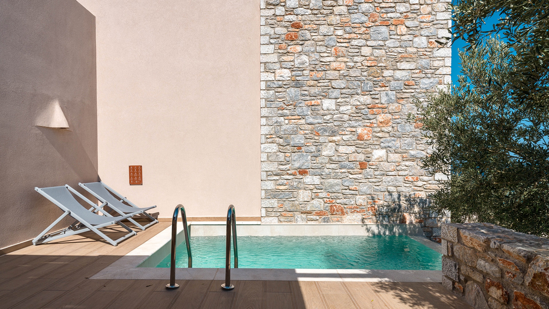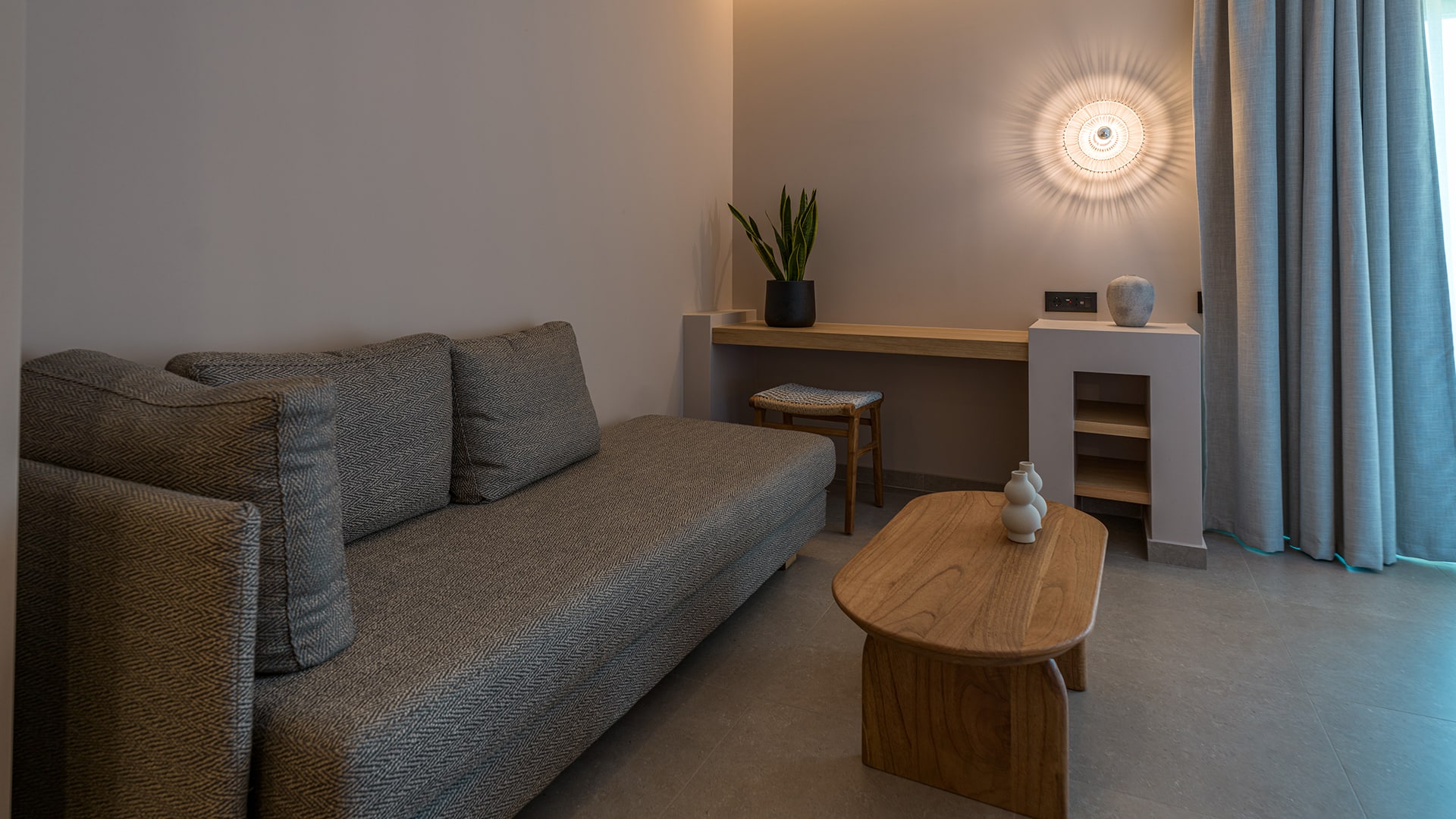 Elegant and serene, the Pool Junior Suite is designed for pure relaxation. This stylish retreat features a king-size bed, a cozy sofa bed, and a sleek bathroom with a walk-in rain shower. Floor-to-ceiling windows open onto a secluded terrace, where a private pool invites you to unwind in complete privacy. Embraced by the resort’s tranquil surroundings, this suite is a haven for laid-back luxury.
